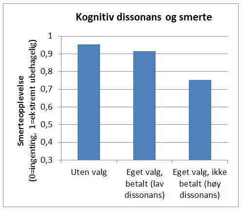 Resultatene var oppsiktsvekkende på 70-tallet, men føyer seg i dag inn i en rekke liknende studier. Det var ingen vesentlig (eller signifikant som heter på forskersk) forskjell mellom kontrollgruppen og gruppen som fikk betalt (lav dissonans). Gruppene oppga i snitt henholdsvis 95 og 92 på smerteskalaen, på grensen mot «ekstremt smertefullt».